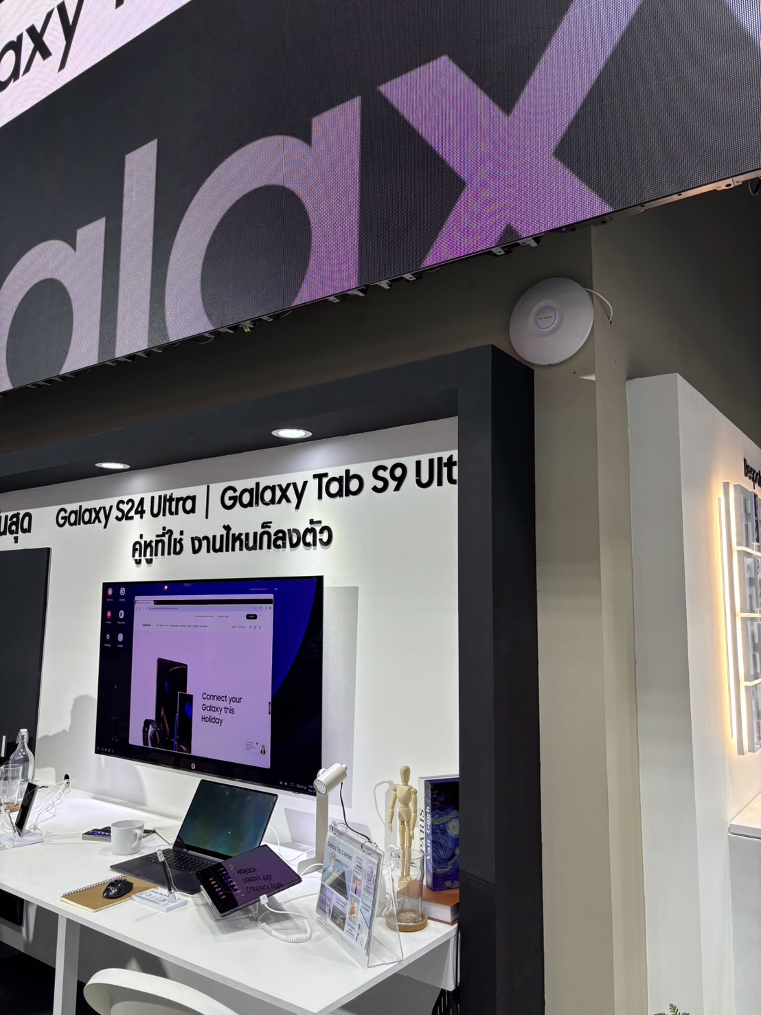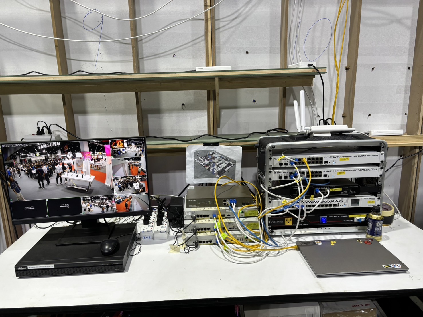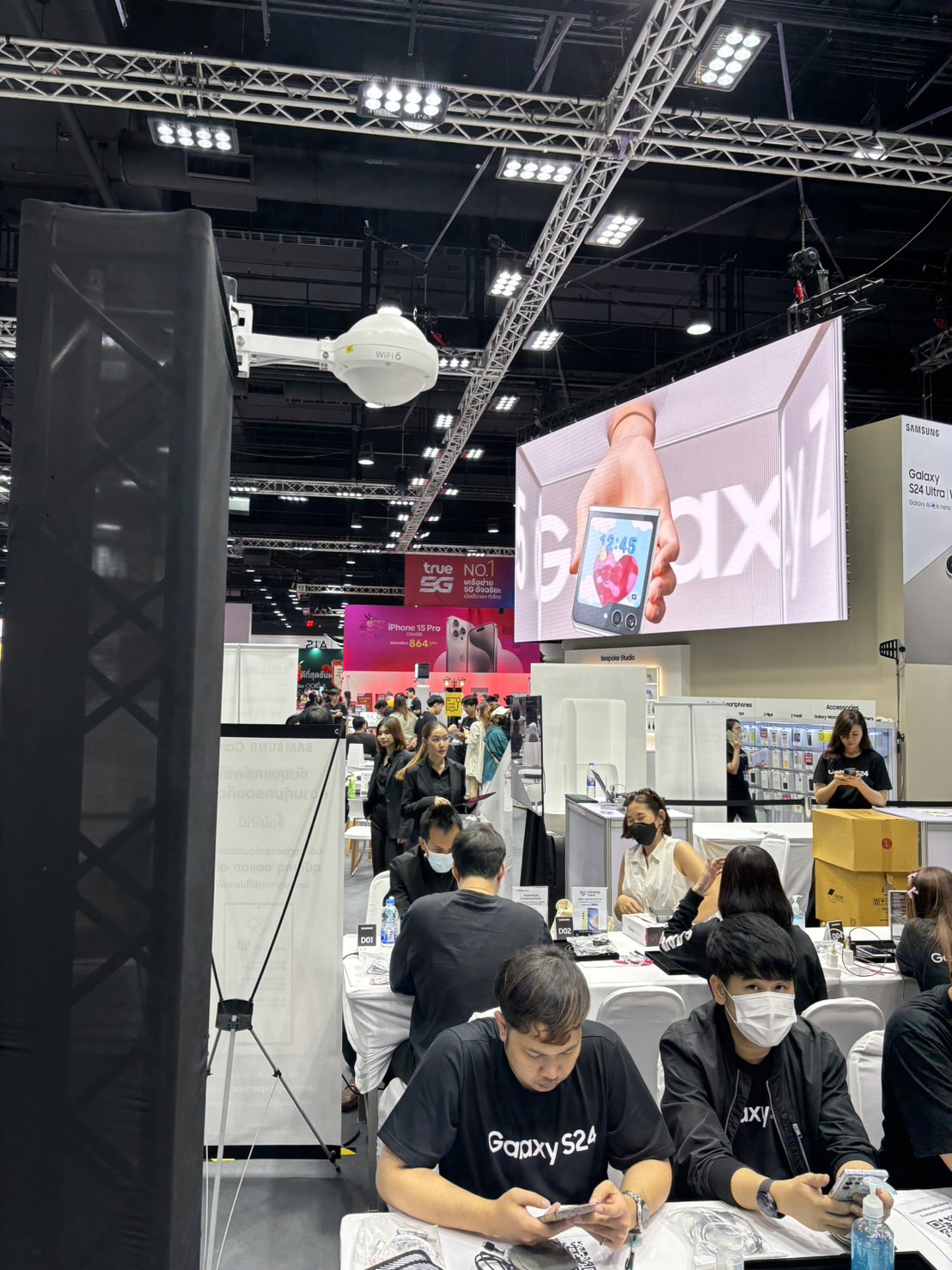 กระจายสัญญาณ WiFi ครอบคลุมทั้งบูธ โดยงานี้ใช้อุปกรณ์ถึง 2 ค่ายด้วยกัน แบ่งกันไปเลยคนละครึ่งบูธ ผลคือ สบายๆ เอาอยู่